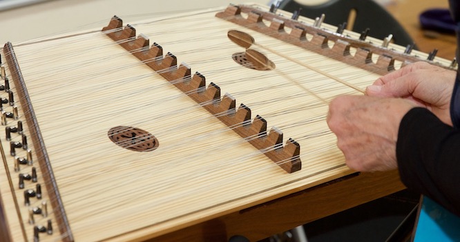 The Hammered Dulcimer has metal strings stretched across a trapezoid shaped frame and is usually played with small hammers. Its origins are lost in history but it probably came from the Middle East, before spreading across most parts of the world. In each country, it has a different name: in Hungary a cimbalom, in Germany a hackbrett, in Mexico a salterio, in the Middle East and India the santur, and in China the yangqin.